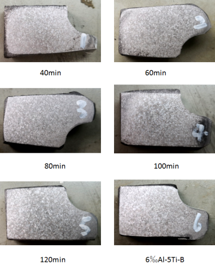 本次對比性試驗(yàn)及試用,歷時(shí)兩天,共進(jìn)行了三次反復(fù)試驗(yàn),由渤;钊麖埧傊鲗(dǎo)安排實(shí)驗(yàn),技術(shù)部孟主任、徐工、范工參與執(zhí)行。細(xì)化標(biāo)的鋁合金AlSi12,配制每爐200kg鋁液,三次試驗(yàn)的AlTi5C0.2添加量分別為2‰、2‰、6‰,添加位置分別為精煉除氣前、精煉除氣后并再攪拌2分鐘、精煉除氣前,實(shí)際細(xì)化時(shí)長均超過120分鐘,期間每20分鐘取一次樣,每次試驗(yàn)共取6個(gè)樣塊。