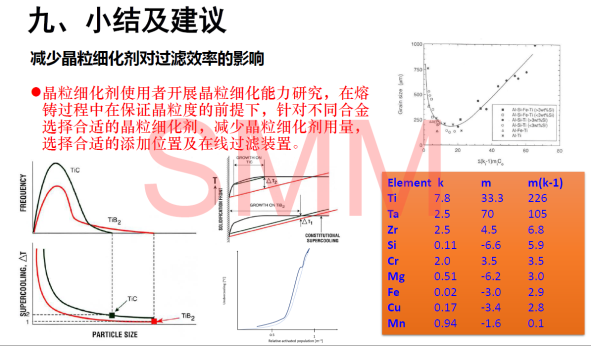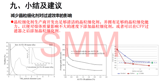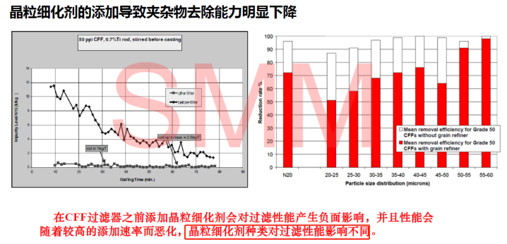 據(jù)丁總調(diào)查顯示,常用細化劑會對CFF過濾器的過濾性能產(chǎn)生負面影響,并隨較高的添加速率而惡化,并顯示晶粒細化劑種類對過濾性能影響不同。據(jù)業(yè)內(nèi)相關(guān)試驗調(diào)查,鋁鈦碳或因無TiB2,從而減少對CFF過濾器的吸附、堵塞,會大大降低細化劑對過濾器性能的影響。