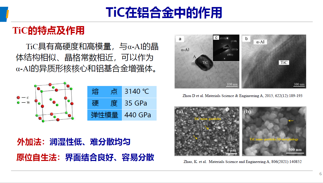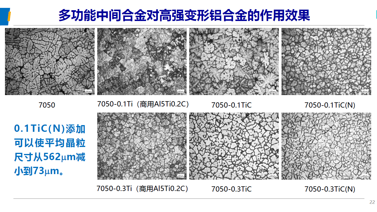 隨著新興的綠色鋁加工聚集區(qū)的建立,新的鋁加工熔鑄產(chǎn)能也隨著電解鋁產(chǎn)能的轉(zhuǎn)移而新興,整體鋁加工熔鑄產(chǎn)能持續(xù)擴(kuò)充,加劇了行業(yè)競(jìng)爭(zhēng)的激烈程度,促動(dòng)了整個(gè)鋁加工行業(yè)產(chǎn)品及技術(shù)的加速升級(jí)和進(jìn)步。本次峰會(huì)北京航空航天大學(xué)云南創(chuàng)新研究院肖文龍博士發(fā)表了題為“Al-TiC(N) 多功能中間合金的制備及應(yīng)用”的報(bào)告,首次系統(tǒng)性的展示了鋁基TiC增強(qiáng)復(fù)合材料,通過(guò)晶粒細(xì)化、復(fù)合強(qiáng)化、組織優(yōu)化等途徑,對(duì)于鋁合金基體的常溫、高溫力學(xué)性能的大幅提升。作為公司的戰(zhàn)略儲(chǔ)備技術(shù),我司峰越科技已開(kāi)始6%TiC含量鋁基碳化鈦顆粒增強(qiáng)材料的工業(yè)化批量生產(chǎn),并成功應(yīng)用于6xxx系合金的強(qiáng)化、2219合金強(qiáng)化、7034焊絲以及增材制造材料的生產(chǎn)。